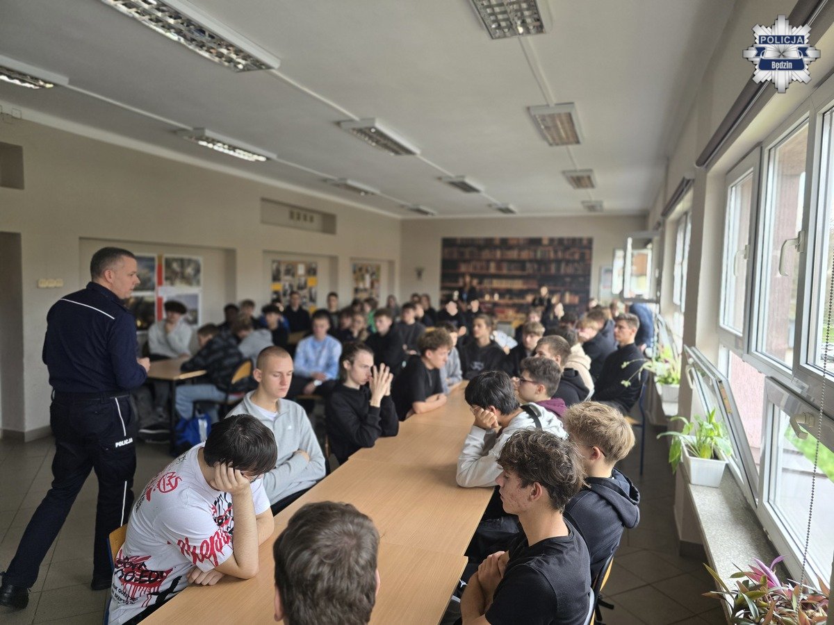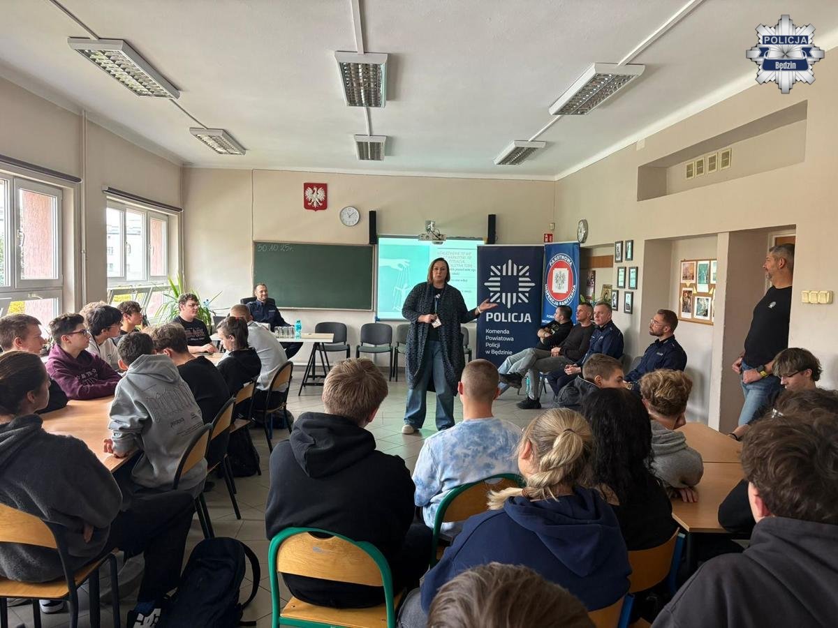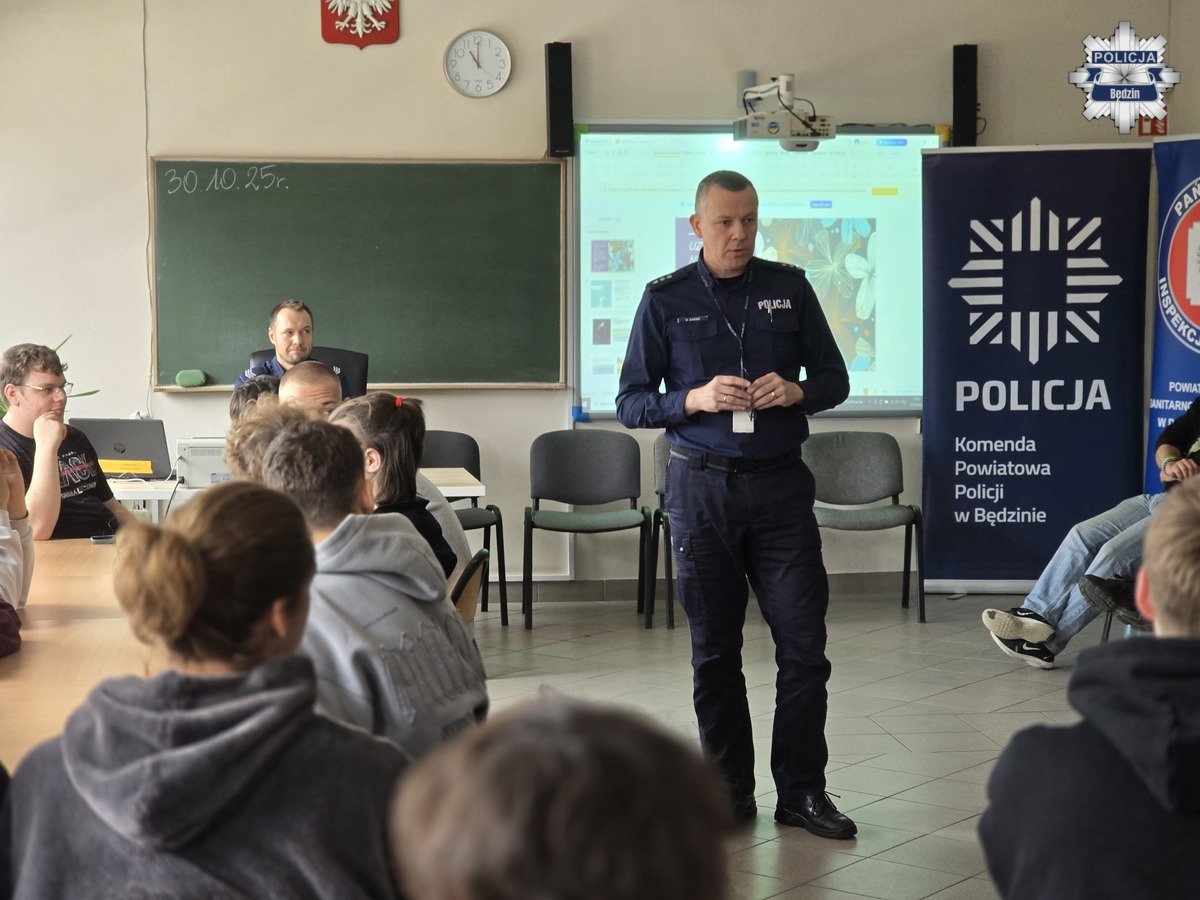 Pod koniec października b.r. w Centrum Kształcenia Zawodowego i Ustawicznego w Będzinie policjanci przeprowadzili debatę społeczną pod hasłem „Zadbaj teraz o swoją przyszłość bez uzależnień”, która skierowana była do uczniów klas III i IV. Wydarzenie zgromadziło blisko 50 uczniów, którzy mieli okazję wysłuchać wystąpień ekspertów oraz aktywnie uczestniczyć w dyskusji na temat zagrożeń związanych z uzależnieniami.