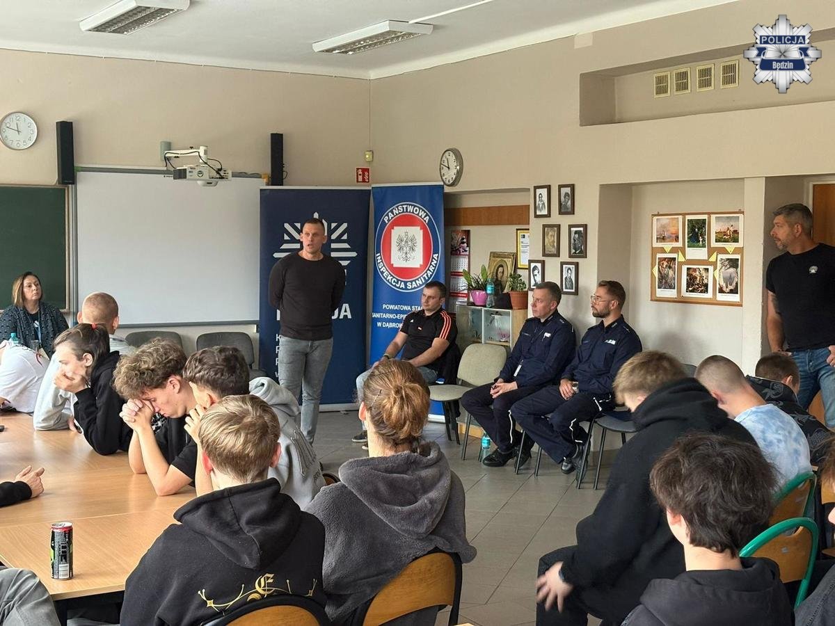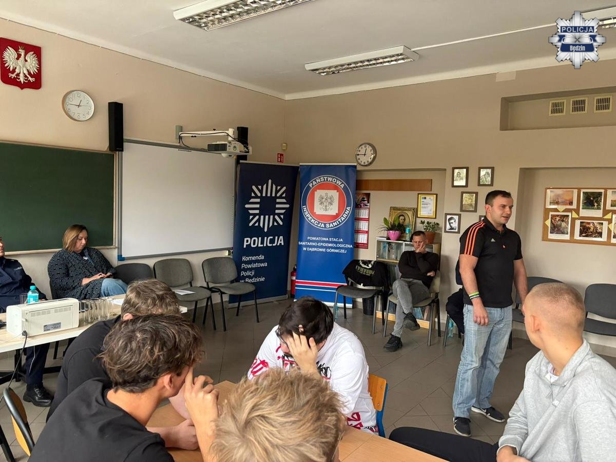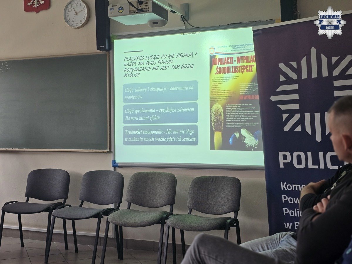 Będzińscy policjanci omówili ważne kwestie, związane z odpowiedzialnością karną związana z posiadaniem narkotyków. Przybliżyli młodzieży przepisy prawa związane z posiadaniem, rozprowadzaniem oraz zażywaniem substancji zabronionych. Podkreślili również, że nieświadomość prawa nie zwalnia z odpowiedzialności, a konsekwencje takich działań mogą wpływać na całe życie młodego człowieka. Ponadto wielokrotnie przypominali o własnej świadomości oraz informowali, że jedna decyzja może zmienić życie, dlatego warto wybierać mądrze.